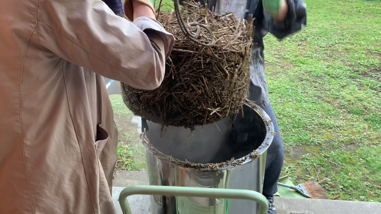 In addition, during this interview, we were able to see the work after the distillation, held every day at the Kitami Mint Memorial Museum. We were able to capture very valuable footage. In the case of the stainless steel distillation equipment at the Museum, the steamed grass is lifted out of the body of the chamber. We have also made a video of this process, so please take a look (Photo 17). The steamed residue produced here is also used as fertilizer by cutting the large branches into short lengths with scissors and plowing them into the thin grain field in front of the museum.