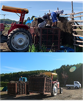 At this time, we are enveloped in a large amount of steam and the unique aroma of the distillation. (This is the most impressive moment, and you can only experience it if you are there. I highly recommend you experience it there!!) After that, the cover of the chamber is lifted using a pulley, and the steamed dregs are pulled out on the pedestal (Photo 15). They are transported using a wheel loader and loaded onto a light truck (Photo 16). (This steamed dregs is plowed into the fields and reused as fertilizer.)