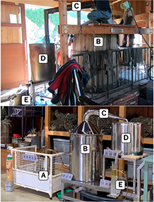 Let's compare Nikoro's distillation equipment with that of the Kitami Mint Memorial Museum, the stainless-steel equipment in demonstration every day (Photo 6). Steam generated in the boiler (A) is blown from the bottom of the extraction chamber (B) filled with hay, passes through the introduction pipe (C) and the snake pipe (D), where it is cooled by water and condensed, finally drops into the water/oil separator (E). By the time it enters the separator, it has already separated into water and oil. Due to the difference in density, yo'll see an oil layer (upper layer) and a water layer (lower layer). Only the upper oil layer can be easily extracted.